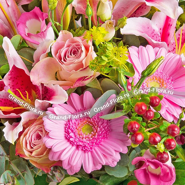 ДЕЛЮКС: лилия розовая - 5 шт., роза розовая - 11 шт., гербера розовая - 7 шт., эустома розовая - 4 шт., гиперикум красный - 5 шт., эвкалипт - 5 шт., рускус - 5 шт., бант розовый.